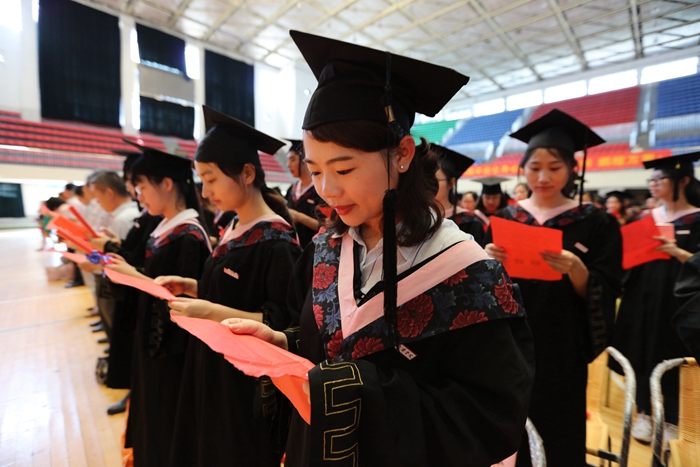 仪式上,在校生代表从毕业生手中接过了绣有湖商精神的旗帜。全体毕业生向母校庄严宣誓,“铭记校训,常怀感恩,爱国守法诚信为本,恪敬职守勇于担当,求真务实努力创新,报效祖国服务人民,为实现伟大的中国梦而努力奋斗!”