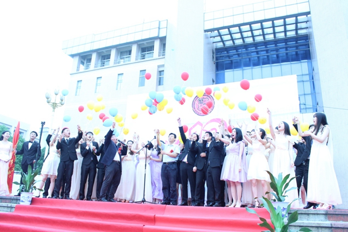 刘国权副校长兴致盎然地和师生走上红毯并讲话,勉励同学们不忘母校培育之恩,运用所学专业知识,积极创新创业,成为行业的佼佼者,并与同学们一道放飞了祝福气球。