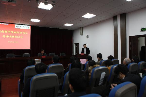 12月15日下午,学校在二办301会议室举行了副处级岗位竞聘演讲测评会。25名报岗者就党委组织部副部长、党政办副主任、研究生院副院长等6个副处级岗位进行了竞聘演讲。全体校领导、二级单位党政主要负责人、岗位所在部门的副处级干部、市级及以上两代表一委员参加会议并担任评委。校党委委员、组织部部长胡穗主持会议。