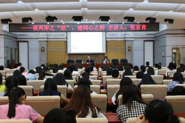“欲穷千里目,更上一层楼。”为推动两岸文化发展,促进湘台文化交流,6月3日晚,美国哥伦比亚大学政治学博士,原台湾政治大学校长、台湾政治大学国际关系研究中心主任,现台湾中华湖湘文化发展协会理事长、台湾中华两岸经贸投资文化教育协会理事长张京育先生作客湖南商学院“麓山大讲堂”,在岭南报告厅内畅谈两岸解“结”建“桥”之道。