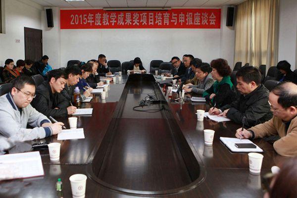 4月16日上午,学校在二办公楼401会议室举行2015年度教学成果奖项目培育与申报座谈会,座谈会邀请省教育厅高教处处长唐利斌作辅导报告,副校长杨虹出席会议,会议由学校高教研究所所长柳德荣主持。