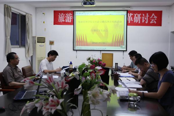 在旅游管理学院的专题民主生活会上,党总支书记高守贵汇报了会前准备情况, 宣读了学院领导班子对照检查材料。班子成员逐一开展了批评与自我批评。校群众路线教育实践活动第二督导组组长张选众对旅游管理学院专题民主生活会进行点评。