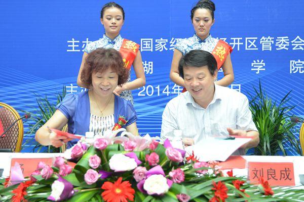 杨虹副校长在仪式上致辞,并代表学校与国家级浏阳经开区管委会副主任刘良成签订《战略合作协议》。随后,两人共同为“湖南商学院 国家级浏阳经济技术开发区教育培训中心”揭牌。