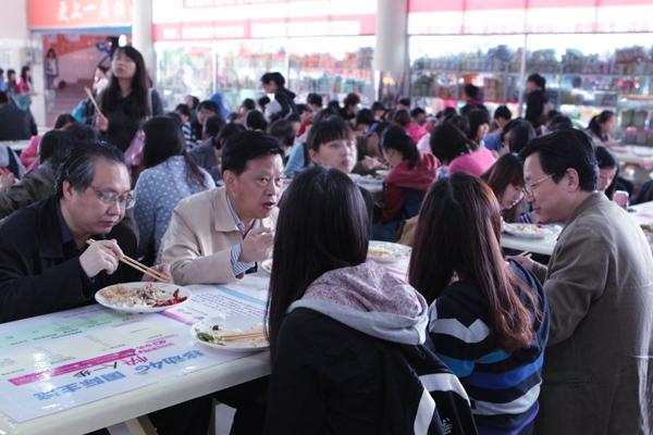 中午,督察组成员、校领导在食堂与同学们一起用餐。