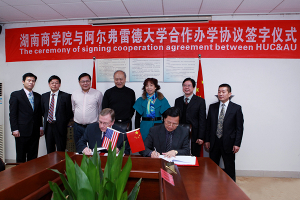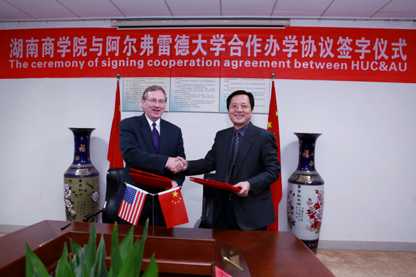 12月13日,美国阿尔弗雷德大学校长查理·艾德蒙森教授和夫人劳拉·格雷森教授以及该校商学院院长黄志天教授等一行访问我校,并就开展本科生交流合作培养、合作举办MBA项目、师资互派等与我校唐未兵校长进行了深入的沟通交流。在此基础上,双方就两校合作框架备忘录、合作举办MBA项目、开展本科生交流培养等举行了签字仪式,从而正式启动了我校与美国阿尔弗雷德大学的合作。杨虹副校长、曾伏秋副校长和国际交流处、教务处负责人等出席了签字仪式。