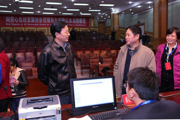 11月10日至14日,湖南商学院报考点2014年硕士学位研究生招生报名进行现场确认。11日下午,校长唐未兵、副校长王明高来到图书馆多功能报告厅,检查我校硕士学位研究生招生报名现场确认工作。