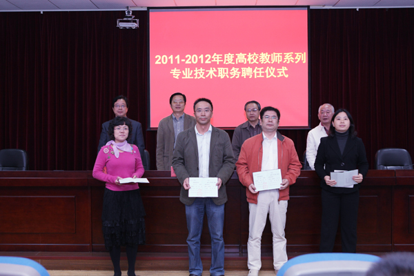 会议在雄壮的国歌声中开始。曾伏秋副校长宣读了2011——2012年度教师系列专业技术职务聘任文件,2011——2012年度我校新聘各级教师系列职称人员32人,其中正高职称人员10人,副高职称人员7人,中级职称15人。