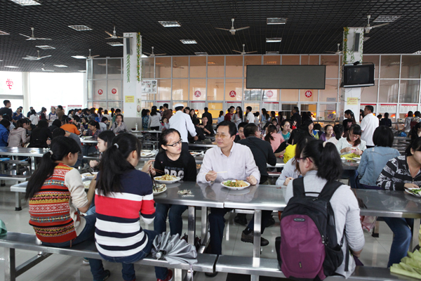 校长唐未兵检查了学校食堂的运行情况,并与同学们共进了午餐。唐校长与就餐同学进行了交流,倾听了同学们对食堂饭菜质量、价格等方面的意见。