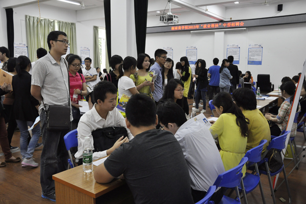 5月17日,我校2013届毕业生&“就业帮扶&”中型招聘会(第二场)在我校实验楼一楼招聘会场举行。此次招聘会共邀请了30家用人单位,其中包括湖南三一工程机械有限公司、中国人寿保险股份有限公司、长沙矿山研究院、招商证券股份有限公司等省内外知名企业。本次招聘涉及会计、财务管理、市场营销、国际贸易、金融、工商管理、人力资源、物流管理、中文、法学、计算机等20余个专业,共为毕业生提供近500个就业岗位。