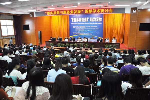 5月17日,由湖南商学院、湖南省质量技术监督局、湖南省质量协会、湖南省管理科学学会共同主办的&“服务质量与服务业发展&”国际学术研讨会在我校举行。省质量技术监督局党组成员、副局长、省质量协会副会长周笑春,省质量技术监督局副巡视员周建民及我校副校长彭进清出席会议,美国阿尔弗雷德大学孔子学院院长Wilfred• Huang教授 、德国巴登-符腾堡州立大学商务信息系统管理学院院长Juergen Seitz教授和长丰集团、湘电集团、湖南省机场集团、湖南银华集团、湖南省标准化研究院、湖南省电力设计院等30余家单位和企业参加研讨会。会议由工商管理学院院长兼湖南商学院服务质量研究中心主任黄福华教授主持。