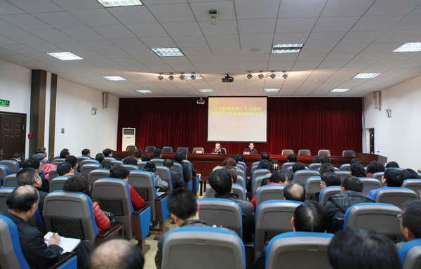 12月18日下午,学校在二办公楼301会议室召开党委中心组理论学习(扩大)会议,听取省委宣讲团&“学习贯彻党的十八大精神,加快科学发展富民强省进程&”宣讲报告会。报告会由省委宣讲团成员、省委宣传部巡视员李湘舟担任主讲,全体在家校领导及学校副处级以上干部聆听了报告会,校党委书记欧阳峣主持报告会。