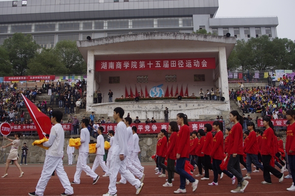 3000余名师生齐聚校田径场参加我校一年一度的体育盛事。上午8点半,运动员入场式正式开始,由裁判员、教职工组成的方阵首先进场。伴随着运动员进行曲激昂的旋律,来自全校各二级学院的14个方阵依次进场。身穿黄色队服的经贸学院方阵犹如古代战士出征,整个出场式由一个鼓手统一指挥,擂鼓摇旗,格外振奋人心;会计学院气势恢弘,200多人的庞大方阵,迸发出嘹亮的口号和强大的气势,随着队形变换,整个队形出现了&“会计&”字样;设计与艺术学院创意无限,威武的军装少年护卫着院旗走在队首,身着汉服的青年才俊紧跟其后,古代着装的佳人在两侧翩翩起舞,整齐统一的变幻出&“C&”、&“S&”字样;外国语学院则将迎接&“十八大&”召开的主题与入场式相结合,鲜艳的党旗熠熠夺目。