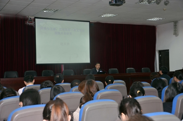 赵教授就当前文字与图像对人们工作与生活的深刻影响,从&“艺术视野下的文字与图像&”,&“文字与图像的异质性&”,&“文字与图像的互渗性&”和&“文字与图像的此消彼长&”四大方面对&“异质与互渗—艺术视野下的文字与图像&”这一主题进行了深入而详细的阐述。赵教授在讲座中引用托尔斯泰小说中关于马斯诺娃的描写与张艺谋的电影艺术等典型事例,生动地阐述了文字的直观性和图像的具象性的内在区别与外在联系。他鼓励在校大学生拓宽阅读面,并提升对文学作品的鉴赏能力。