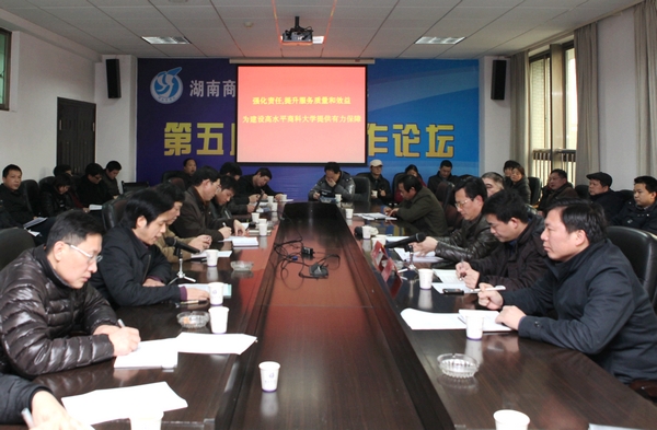 在会上,资产管理处处长王建明,后勤基建处处长熊卫平,后勤服务总公司副总经理丁小尧,北津学院副院长王志安、罗维新分别围绕&“强化责任,提升服务质量和效益,为建设高水平商科大学提供有力保障&”的会议主题,汇报了本部门的工作重点、具体思路,以及对高校后勤社会化改革的思考与建议。与会人员就相关主题作了自由发言。