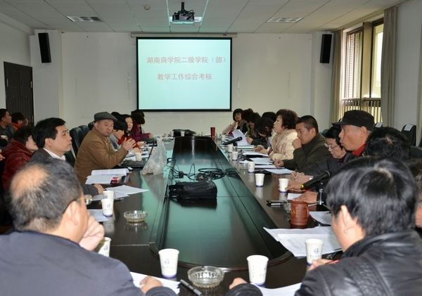 本次会议根据《湖南商学院二级学院(部)教学工作综合考核实施办法》(校行发〔2010〕55号)文件精神,主要从A类指标项目中领导班子的教学管理工作及水平、导师工作、教学研究与改革活动、教学质量保障体系、教学工作特色五个方面考核二级学院(部)的教学工作质量与管理业绩。
