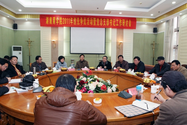 12月29日,湖南商学院2011年创先争优暨党总支部书记工作研讨会召开。校党委书记欧阳峣、校长唐未兵、校党委副书记夏继春、校纪委书记陈丽影出席,各二级单位党总支书记及各党务职能部门负责人参加会议。会议由校党委副书记夏继春主持。