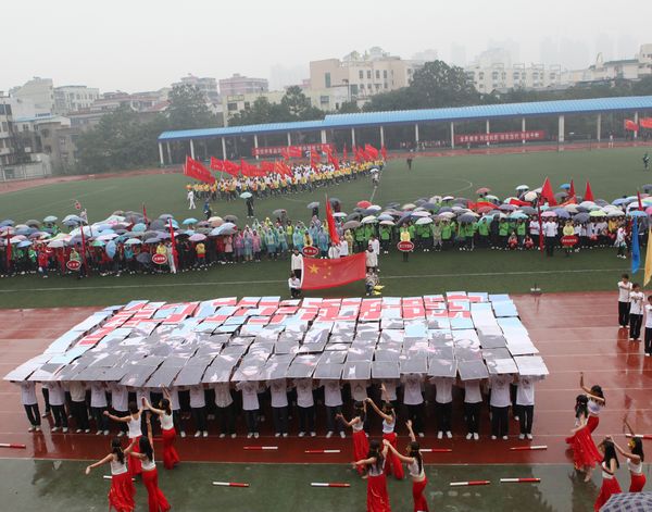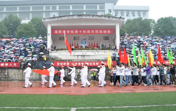 10月28日上午,伴随着激扬的运动员进行曲,我校第十四届田径运动会隆重开幕。3000余名师生在斜风细雨中共聚田径场参加一年一度的学校体育盛事。校领导欧阳峣、唐未兵、李泽华、杨虹、曾伏秋、陈丽影、廖明星、刘国权和各二级学院及相关职能部门主要负责人出席了开幕式。开幕式由副校长杨虹主持。