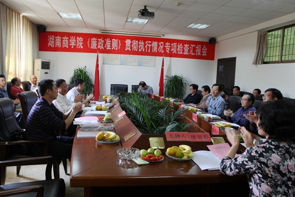 10月18日下午,省教育纪工委《中国共产党党员领导干部廉政从政若干准则》(以下简称《廉政准则》)贯彻执行情况专项检查组来我校进行专项检查。校党委书记欧阳峣汇报了我校贯彻执行《廉政准则》的情况,校长唐未兵在汇报会上致欢迎辞,学校党委成员及各职能处室负责人参加了汇报会,汇报会由校纪委书记陈丽影主持。