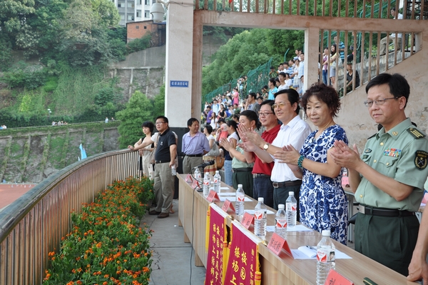 下午4点,阅兵式正式开始。在振奋人心的义勇军进行曲中,校长唐未兵健步走下主席台,在邓崇顺少校的陪同下,逐一检阅了来自13个学院的30 个受训方阵。&“同学们好!&”&“首长好!&”&“同学们辛苦了!&”&“为人民服务!&”,雄壮的口号响彻整个体育场。在随后进行的分列式中,身着绿色迷彩服的方阵队伍迎面走来,整齐的军容,矫健的步伐,昂扬的斗志,无不展现着2011级新生在教官的教导下严格训练的成果。