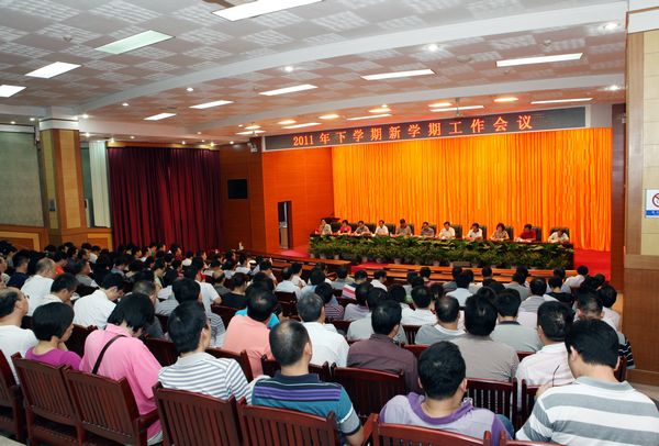 8月28日下午,我校2011下学期新学期工作会议在图书馆多功能报告厅隆重举行。校党委书记欧阳峣主持会议并就加强党的建设、党员创先争优活动及学习型党组织建设进行了部署。校长唐未兵在会上作新学期工作报告。全体校领导及全校副科以上干部、教授、博士参加会议。