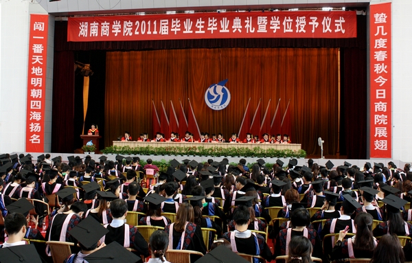 盛夏六月,朝阳似火。21日上午,我校2011届毕业生毕业典礼暨学位授予仪式在体育馆隆重举行。校领导欧阳峣、唐未兵、夏继春、李泽华、彭进清、杨虹、王明高、曾伏秋、陈丽影、廖明星、刘国权出席了毕业典礼。典礼由副校长曾伏秋主持。