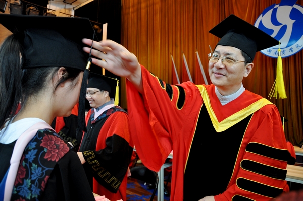 500多名毕业生代表身着学士服参加了典礼。在欢快的乐曲中,毕业生们怀着激动的心情走上主席台,接受各位校领导为其拨正流苏,颁发毕业证书和学位证。