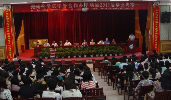 校长唐未兵在典礼上发表了热情洋溢的讲话。他代表学校党委、行政向学业有成、即将告别母校奔赴国外学习深造或走向社会施展才华的全体毕业生表示热烈祝贺,向为同学们成长付出辛勤劳动的教职员工表示敬意,也向始终关心、爱护和支持湖南商学院以及国际教育学院的各位家长以及社会各界人士表示衷心感谢!唐未兵校长列举了我校中外合作办学项目取得的丰硕成果,并为同学们砥砺品学,执着进取,不懈努力的精神感到欣慰和自豪。唐未兵校长还向2011届毕业生提出了殷切的希望:第一要树立远大理想,善于思考,敏于行动;第二要坚守应有的责任,牢记使命,勇于担当;第三要培养高尚的情趣,勤于学习,充实生活;第四要保持良好的心态,宽容自信,激情给力。
