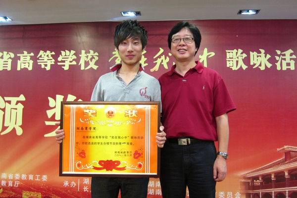 本次比赛的颁奖晚会于19日晚在湖南大剧院举行,副校长曾伏秋教授出席了颁奖晚会。由我校校团委柏志华、杨杨老师指导选送的合唱《在灿烂阳光下》,喜获学生组一等奖。学生饱含深情地唱出了对党、对祖国的无限热爱,充分展示了湖南商学院艺术教育水平和银舟艺术合唱团学生的精神状态与艺术素养。教师组由工会组织,杨杨老师指导,徐平、曾联平老师演唱的《在阳光路上》荣获二等奖,由李友良老师演唱的《祝福祖国》荣获三等奖。此外,我校还获得了湖南省高校建党九十周年&“党在我心中&”歌咏活动优秀组织奖。(校团委 校工会)