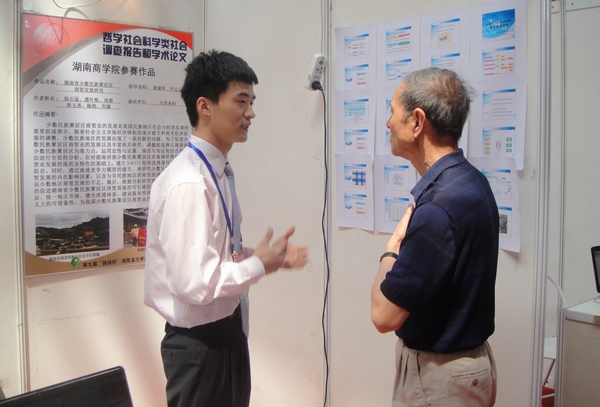 此前,所有参赛作品在中南林业科技大学大学生体育艺术馆展出并接受专家评委的问辩。团省委副书记陈雪楚来到哲学社会科学类调查报告和学术论文展厅参观指导,对我校魏来等同学的参赛作品《&“两型社会&”背景下农地流转推进模式探索——基于长沙大河西先导区农户意愿的调查》进行了指导。教育部社会科学司原司长、全国&“挑战杯&”大学生课外学术科技作品竞赛评委会常务副主任奚广庆,认真指导了我校徐石磊等同学的参赛作品《湖南省少数民族聚居区商贸发展研究》。
