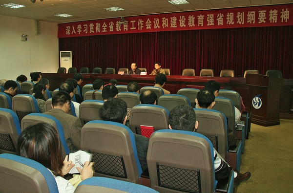 会上,陈飞跃副巡视员在报告中解读了《国家中长期教育改革和发展规划纲要》,阐述了规划纲要的编制背景、指导思想、工作方针、主要特点、发展任务、体制改革和保障措施等;解析了全省教育工作会议精神和《湖南省建设教育强省规划纲要》的主要特点和基本内容,强调要坚持以人为本,遵循教育规律,以素质教育为主线,以提高质量为重点,以改革创新为动力,优化布局结构,提高办学效益,加快我省从教育大省向教育强省的转变,人口大省向人力资源强省转变,为推进&“四化两型&”建设、加快富民强省提供更有力的人才智力支撑。对如何贯彻落实《国家中长期教育改革和发展规划纲要》和《湖南省建设教育强省规划纲要》,陈飞跃副巡视员指出,一要认真学习、准确把握&“两个刚要&”精神,把学习、宣传纲要精神作为当前和今后一段时期工作的主要任务;二要抢抓机遇,站在新的起点,科学谋划学校&“十二五&”发展规划;三要切实转变教育观念,牢固树立人才培养质量观,坚持一切从提高教育质量出发;四要坚持走内涵式发展道路,提高服务社会的能力;五要坚持改革创新,大力推动高等教育可持续发展。