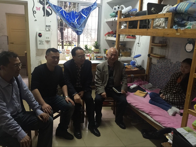 4月12日下午,经贸学院院长柳思维、常务副院长彭炳忠、党总支书记副书记颜建军等一行来到萃雅公寓,亲切地看望了商务1402班的残疾学生陈望同学。