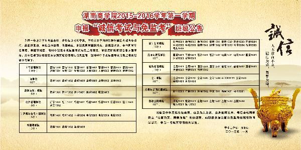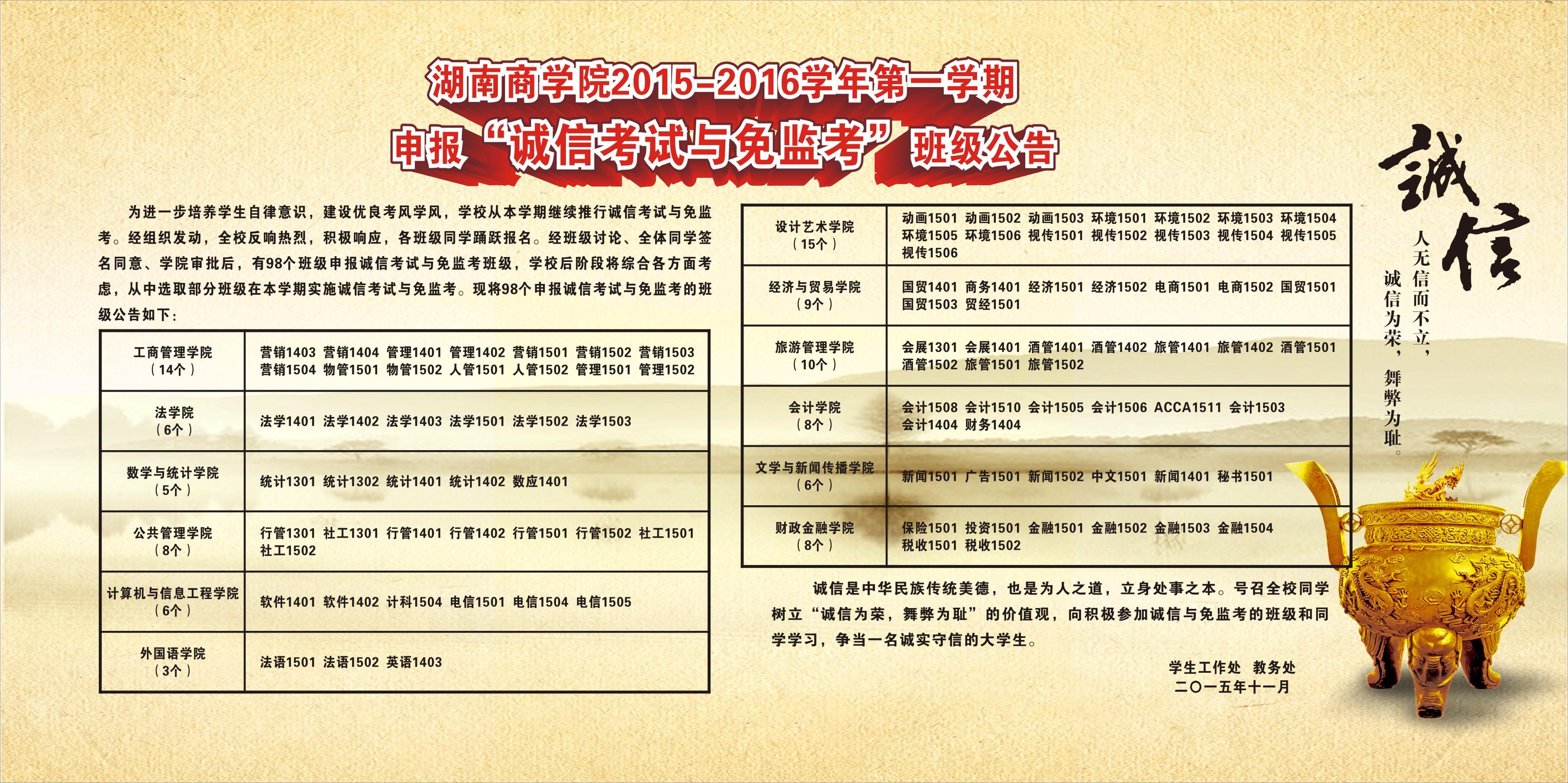 为践行“至诚至信、为实为新”的校训精神,进一步增强大学生诚信意识和主动学习意识,继上学期“诚信考试与免监考”制度成功实施后,学校在本学期期末考试中将继续推行“免监考”的诚信考试制度。各二级学院积极响应,经过班级讨论、全体同学签名同意、二级学院审批后,已有98个班级申报“免监考”班级(具体名单见下图)。学校在后阶段将综合各方面考虑,从中选取部分班级在本学期实施“免监考”。