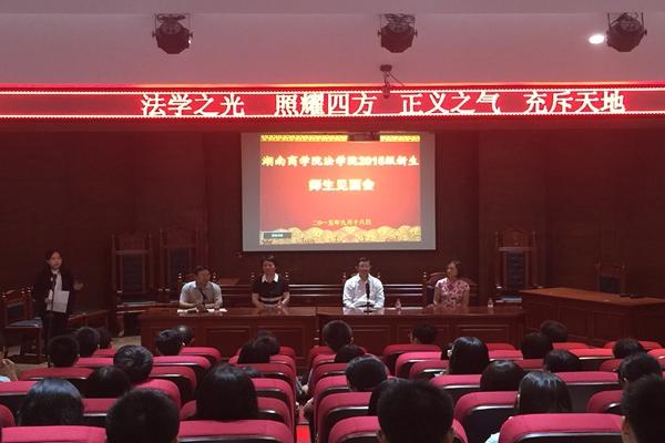 9月18日晚,法学院在三教F101模拟法庭举行2015级新生师生见面会,法学院院长杨峥嵘、副院长曾荇、胡艳香,党总支副书记刘期湘等众多老师参加,法学院本科新生及硕士研究生全部到场。