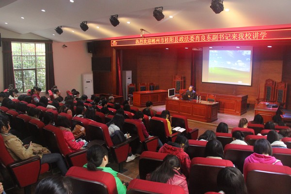 12月7日上午,一场以&“司法监督与司法公正&”为主题的讲座在三教学楼F101模拟法庭举行,郴州市桂阳县政法委肖良东副书记应邀来我校为法学院师生进行讲学。法学院院长杨峥嵘教授,法学院党总支副书记刘期湘副教授,法学院100余名师生参加了讲座。