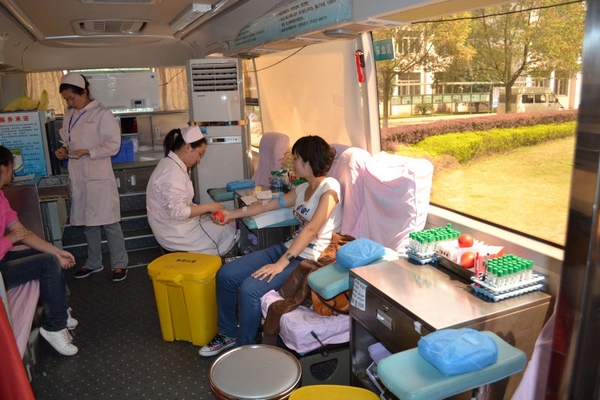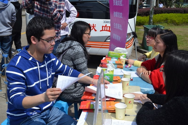 在活动现场,许多同学认真填写献血信息表并勇敢的加入到无偿献血的队伍中。广艺1103班的郝同学更是表示&“不献血的人生是不完美的&”。至活动结束,总共有68位同学完成了无偿献血,总共采集到血液大约27200cc。(张雷洋)