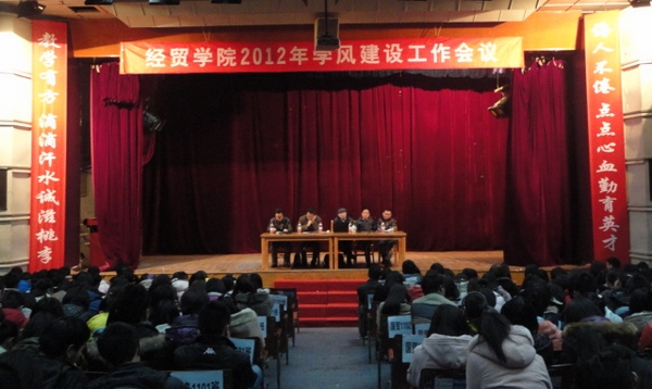 3月6日下午,经济与贸易学院学校大礼堂召开了2012年学风建设工作大会,学院院长刘天祥,党总支书记彭炳忠,副院长刘乐山、刘汉中,党总支副书记颜建军及各班班主任出席会议。2010、2011级全体学生参加大会。