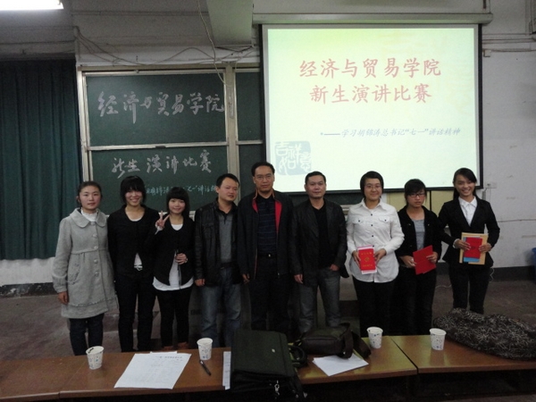10月26日晚,由经济与贸易学院举办的以&“学习胡锦涛总书记‘七一’讲话精神&”为主题的新生演讲比赛在A309会场举行,演讲赛的评委有经济与贸易学院党总支书记彭炳忠,副书记颜建军,学生办公室李小晖老师,谢芳老师,谭颖老师。