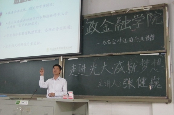 5月11日晚,光大证券长沙分公司经理张健巍及其骨干团队应我校财政金融学院邀请,在F201教室作了主题为&“走进光大 成就梦想&”的讲座。此次讲座为我校财政金融学院系列专业知识讲座第二期,来自金融专业大一至大三的同学们参加了讲座。