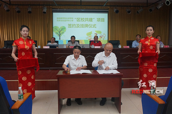 湖南商学院北津学院党总支书记陈卫东与中岭小学校长吴安华签订了“区校共建”合作协议,湖南商学院北津学院院长张贵华与中岭小学校长吴安华为“青少年健康成长辅导室”授牌。
