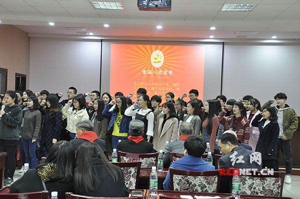 学生党员与抗战老兵重温入党誓词。