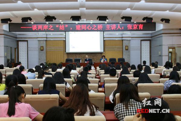 红网长沙6月5日讯(通讯员 章沁 巢进文 时刻新闻见习记者 陈美淇)“继小三通、大三通之后,文化三通的‘通心’工作成为连接两岸人心的最坚实之纽带。”近日,台湾中华湖湘文化发展协会理事长、台湾中华两岸经贸投资文化教育协会理事长张京育作客湖南商学院麓山大讲堂,在岭南报告厅里畅谈了两岸发展的解结通心之道。