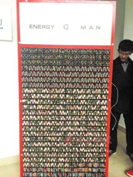 9日,记者在长沙理工大学云塘校区见到这个体积庞大的“大家伙”——Energy?Man,和它的发明者聂翔、谢妍、汤静等人。走进工作室的时候,这群95后的大学生们还在往这个“大家伙”身上安装电池。这个巨型的电能再利用装置,长2米,宽1米,高0.2米。它上面装有300个电池格,每个电池格可以安装5节电池,所以这个“大家伙”身上一共有1500节电池,而这些电池全部都来源于生活中的废旧电池。