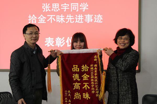 张思宇将钱交给了前台,不久,失主马先生就联系前台取回了钱款。原来,前一天晚上马先生在茶餐厅交接工程款时大意掉了一万块,“第二天来找的时候根本没有抱希望,结果没想到捡到钱的小‘妹陀’竟然如数奉还。前几天,家人不经意间就被人顺走了手机,两件事的对比让我心里很震撼,本来想给她报酬但她不肯要。因此才决定送锦旗给她,希望能扬正气。”3月10日下午,为了鼓励张思宇的行为,号召同学们向张思宇学习,湖南商学院对张思宇的行为进行了表彰,并颁发了失主送来的“拾金不昧 道德高尚”锦旗。