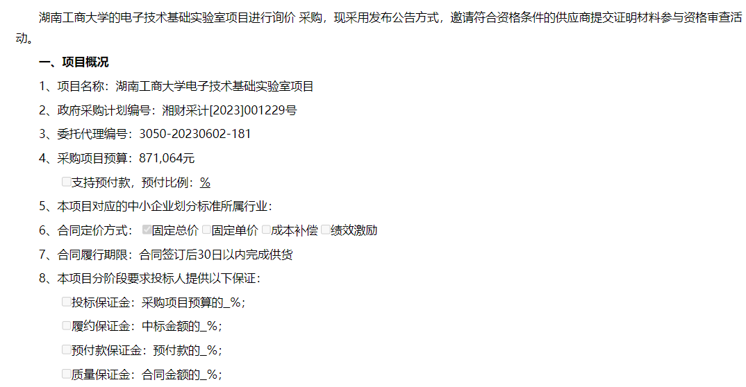 湖南工商大学电子技术基础实验室 项目询价邀请公告