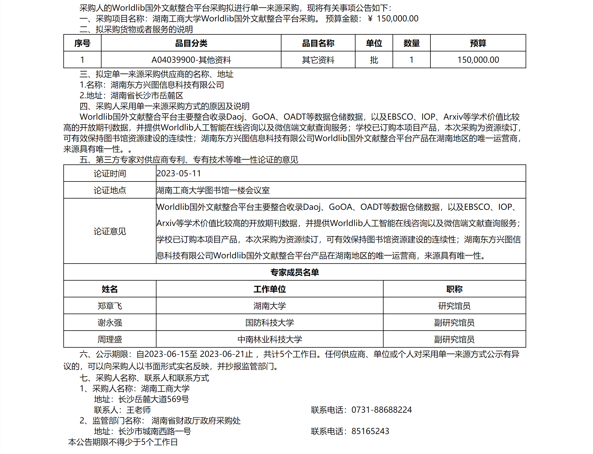 湖南工商大学 Worldlib国外文献整合平台采购 单一来源采购公示