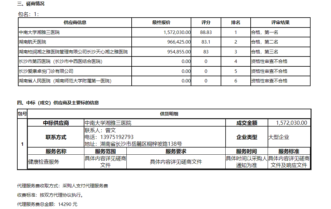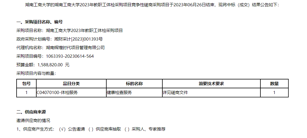 湖南工商大学2023年教职工体检采购中标(成交)公告
