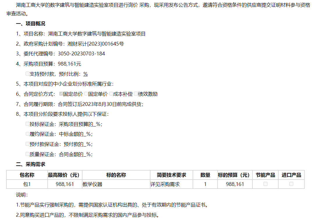 湖南工商大学数字建筑与智能建造实验室 项目询价邀请公告
