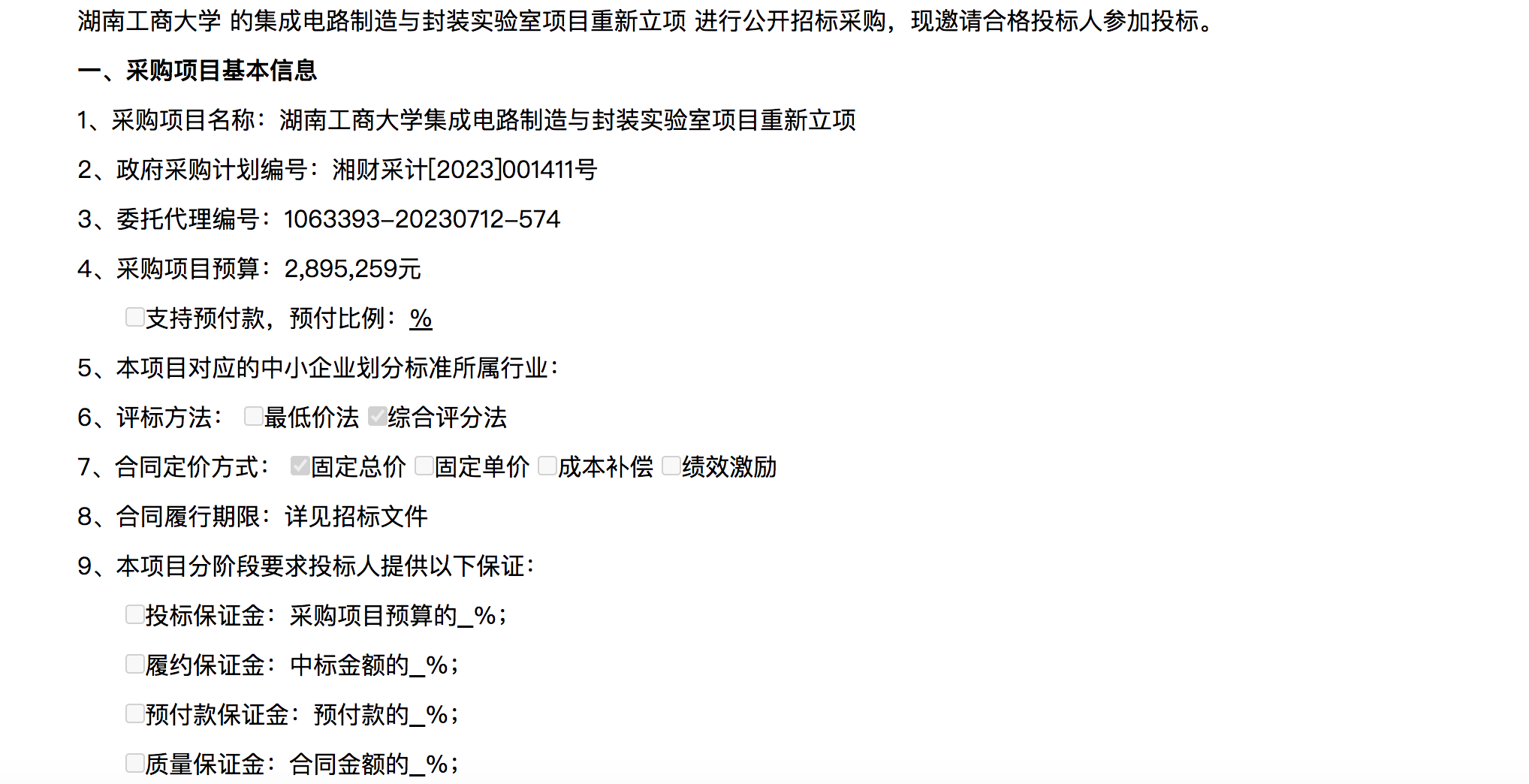 湖南工商大学集成电路制造与封装实验室项目重新立项 项目公开招标公告