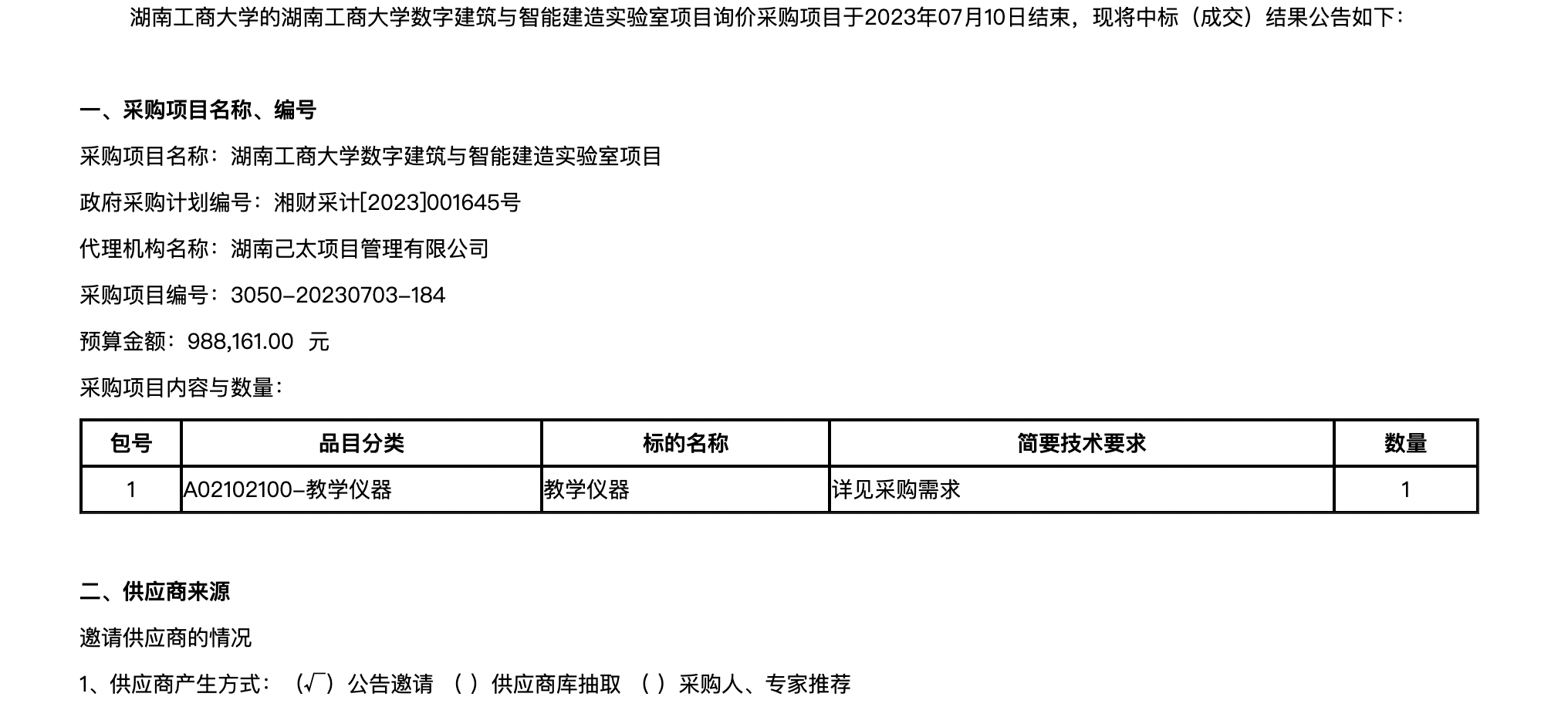 湖南工商大学数字建筑与智能建造实验室中标(成交)公告