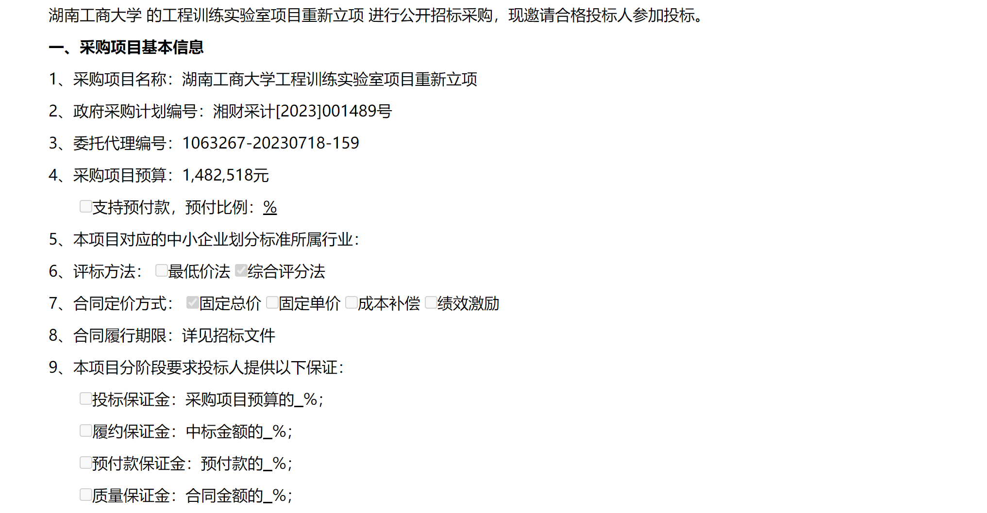 湖南工商大学工程训练实验室项目重新立项 项目公开招标公告